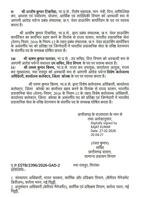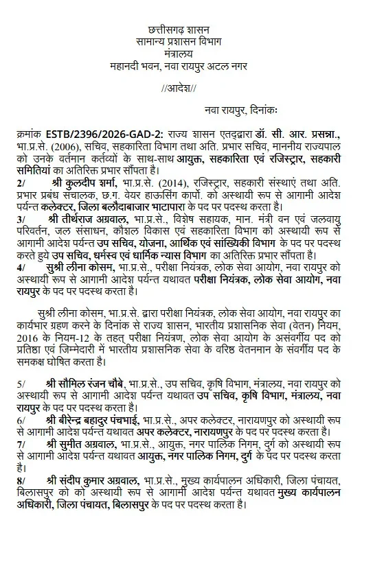 रायपुर// राज्य सरकार ने कई IAS अफसरो की जिम्मेदारी में बदलाव किया है। IAS अवार्ड हुए अफसरों को भी नयी जिम्मेदारी दी गयी है।